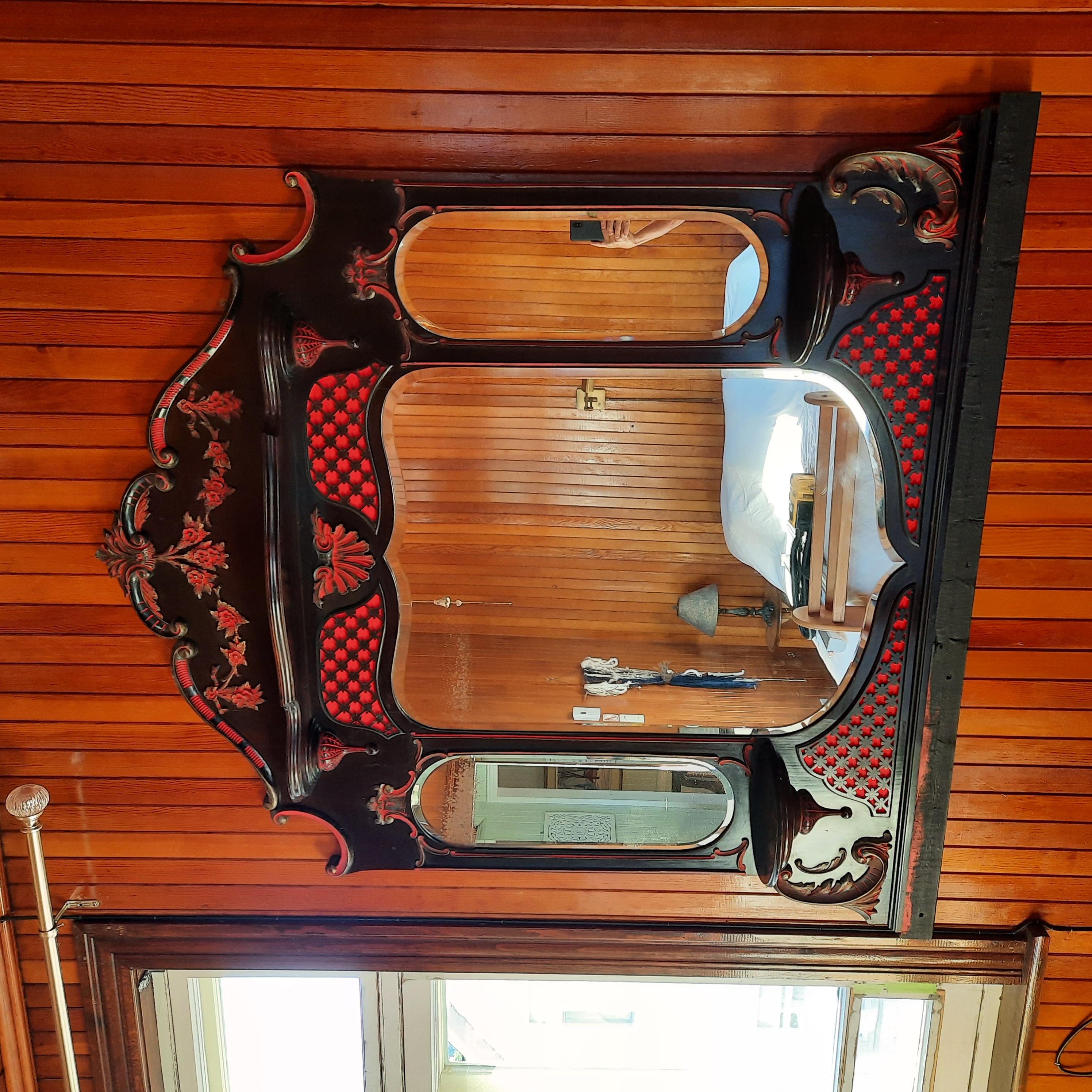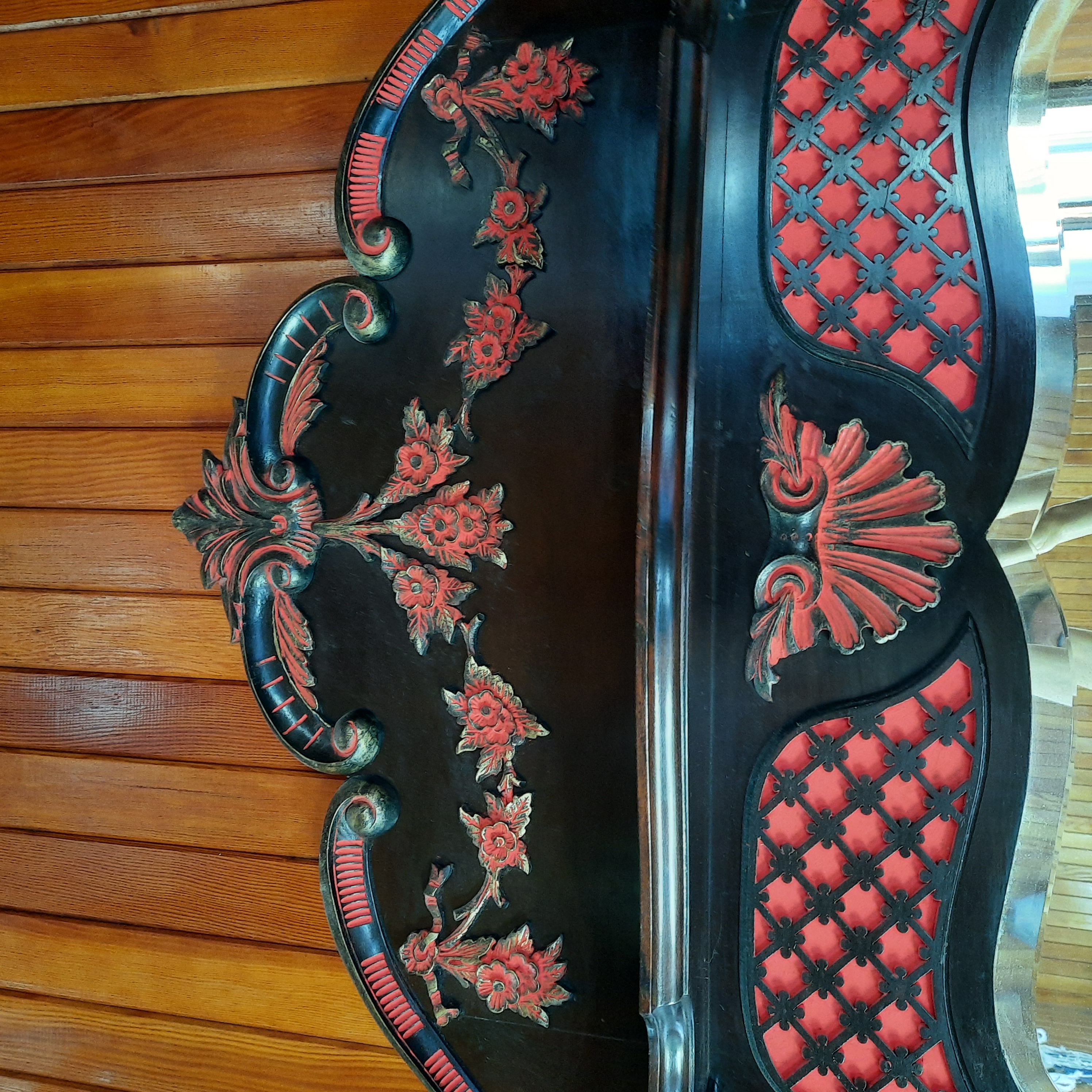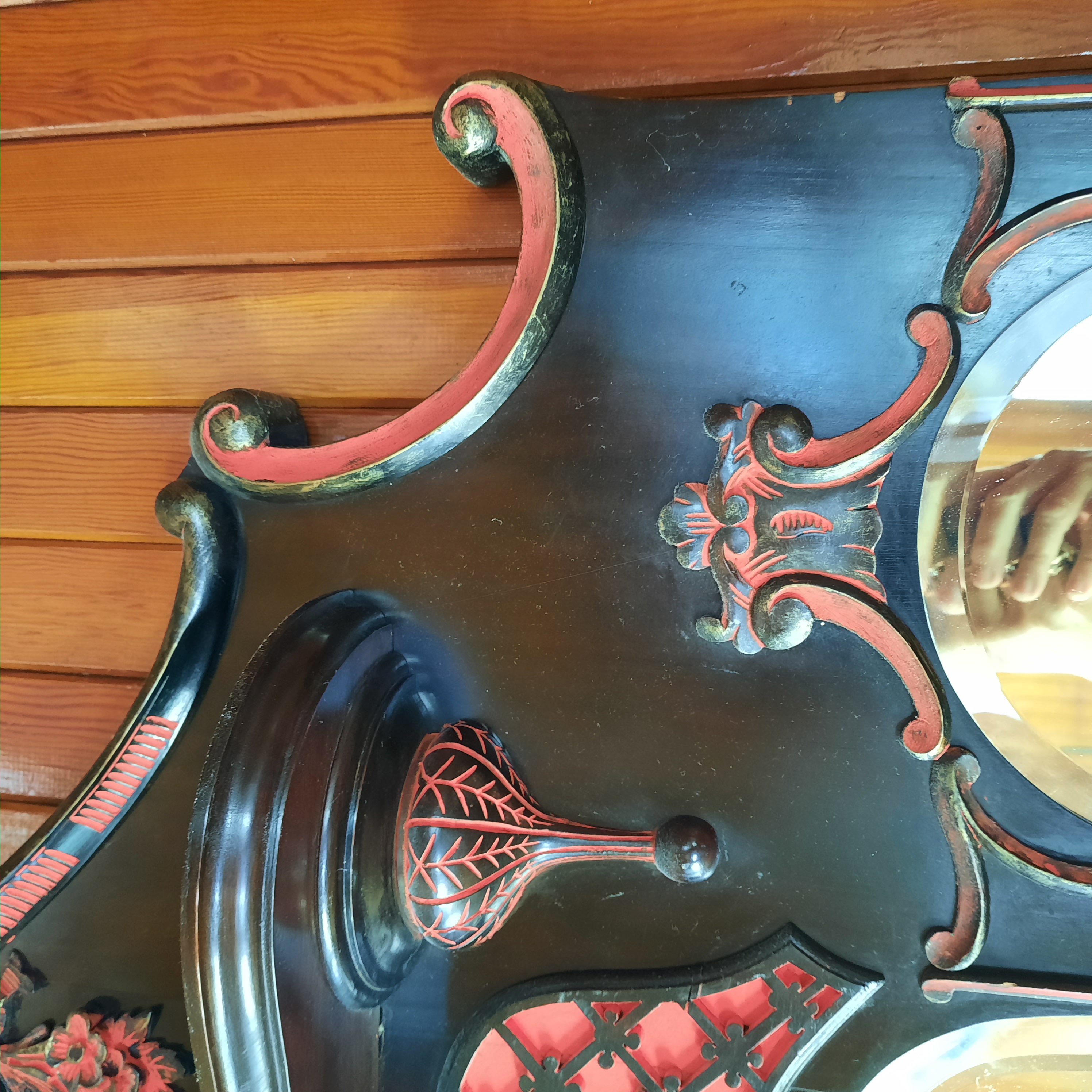 Magnifique miroir biseauté en bois sculpté et peint (noir et rouge) datant du début du XXe siècle, d'inspiration art nouveau / rocaille avec motifs floraux.